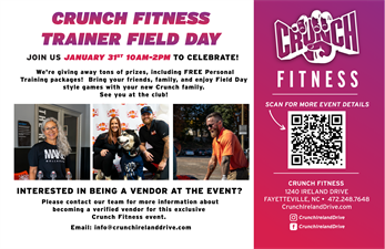 Crunch Fitness is having a Trainer Field Day event to kick off the end of January and start ramping up excitement for our opening in February! There will be local vendors, food trucks, door prizes, and we will be giving away FREE PERSONAL TRAINING PACKAGES! Stop by to meet the team and sign up for a membership!