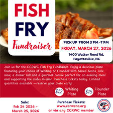 Join us for a delicious evening at the CCRWC Fish Fry Fundraiser! Enjoy a freshly prepared meal featuring your choice of crispy Whiting or Flounder, served with baked beans, cole slaw, a dinner roll, and a gourmet cookie—perfect for a satisfying meal while supporting a great cause.