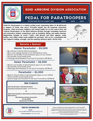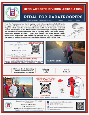 Pedal for Paratroopers is a Tri-Distance Charity Bicycle Ride welcoming cyclists of all ages and skill levels to ride in support of those who serve. This is a rain or shine event focused on community, service, and the enduring Airborne spirit — All the Way.
